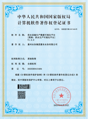 惠州水務(wù)集團所屬惠東水務(wù)公司自主開發(fā)系統(tǒng)獲得軟件著作權(quán)證書