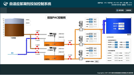 系統(tǒng)主要功能 該系統(tǒng)具備絮凝劑智能投加功能,通過多參數(shù)水質(zhì)數(shù)據(jù)(流量/溫度/濁度/pH等)自動調(diào)節(jié)PID實現(xiàn)精準控制,同步兼容手動干預模式。實時監(jiān)測藥罐液位與攪拌狀態(tài),確保藥劑配備充分、混合均勻,保障絮凝工藝穩(wěn)定高效運行。