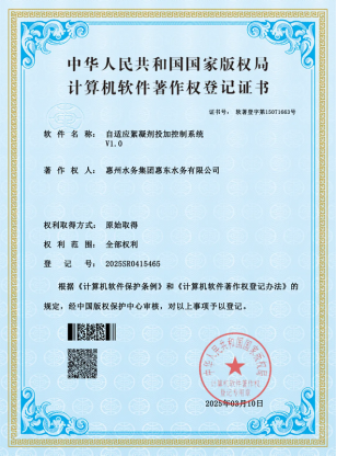 3月10日,惠州水務(wù)集團所屬惠東水務(wù)公司技術(shù)信息中心自主開發(fā)的軟件系統(tǒng)《供水設(shè)施生產(chǎn)數(shù)據(jù)可視化平臺》、《自適應(yīng)絮凝劑投加控制系統(tǒng)》經(jīng)國家版權(quán)局中國版權(quán)保護中心審查,獲計算機軟件著作權(quán)登記證書。